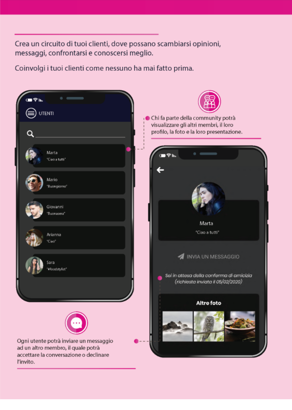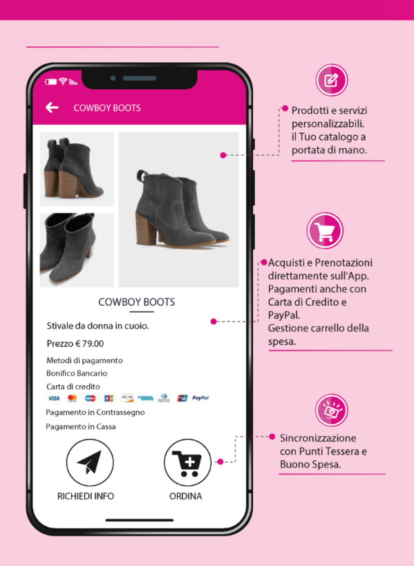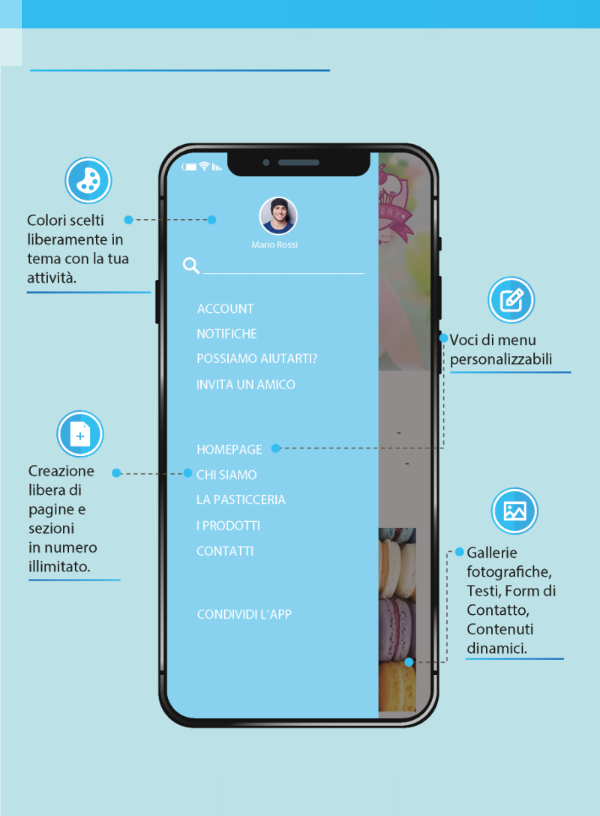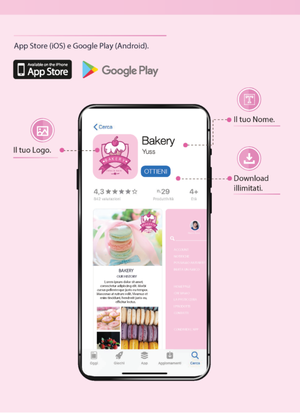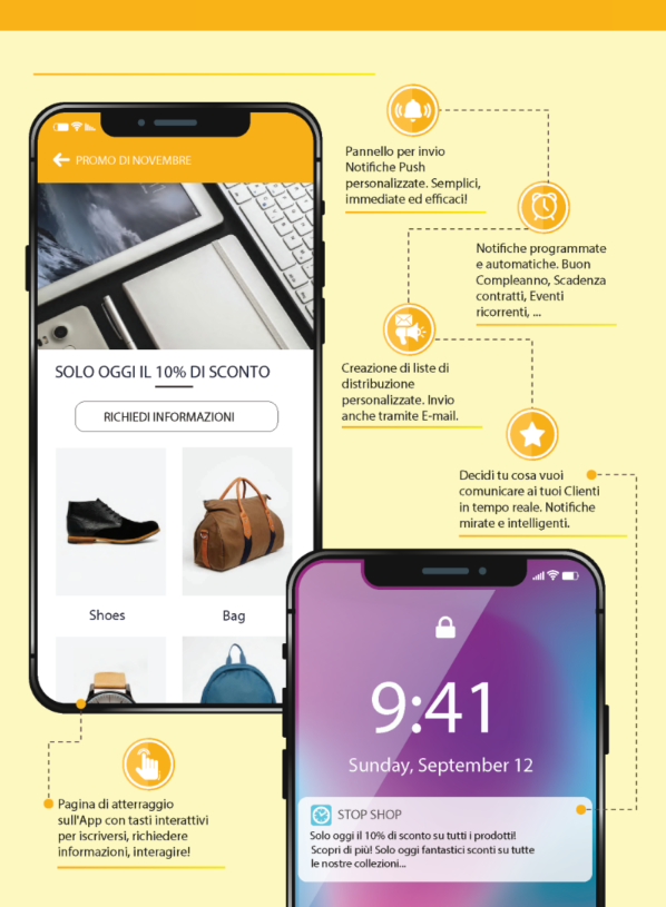 Realizzeremo la tua APP IOS e ANDROD e il tuo Sito ECOMMERCE. I Clienti potranno ordinare e pagare direttamente sulla tua App. Potrai inoltre inviare notifiche push, creare una fidelity card e tanto altro.